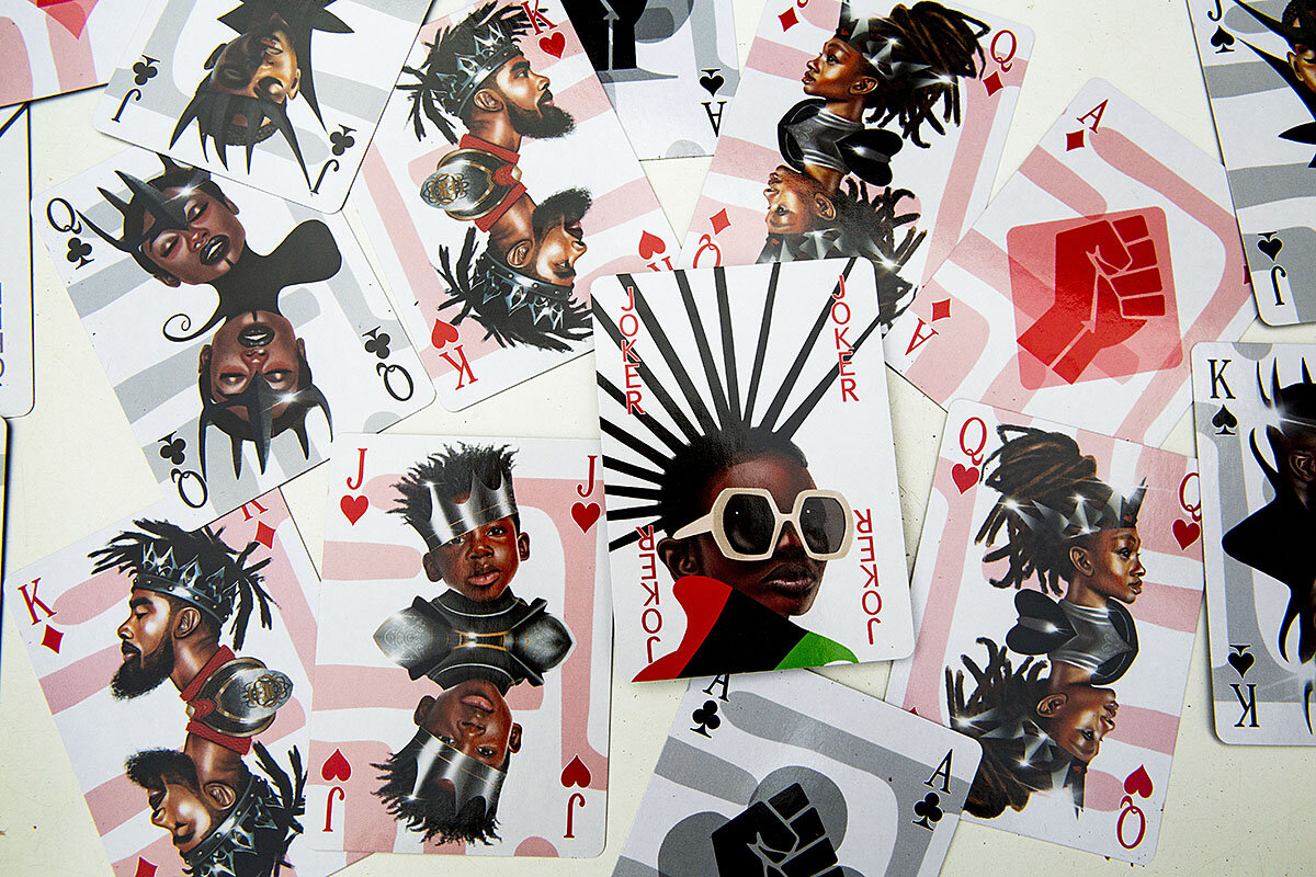 When Mr. Muhammad played Go Fish with his children, he noticed that the deck of cards was stacked with Anglo-Saxon kings, queens, jokers dressed in medieval garb. So the artist created a bespoke deck for his kids. His Black royals look more like everyday people but with crowns. His joker is a woman in a rainbow coat and Jackie O-style square sunglasses. The ace in the pack is a Black Power fist.