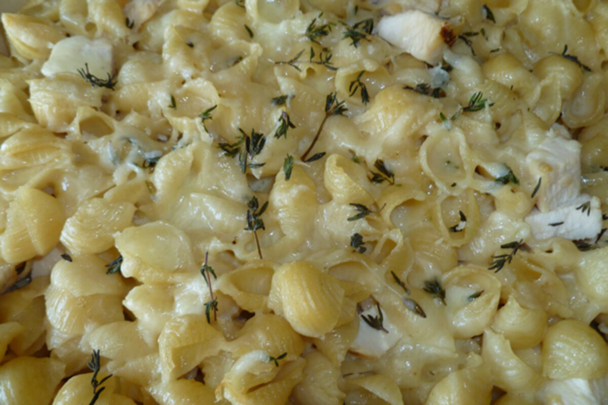 This is a recipe I found on that isn't very low calorie or particularly healthy but is easy enough for me to cook and portion control. I chose it primarily because it uses up the rest of the fontina cheese I had bought for the聽聽I made earlier (boy, that cheese was good for three recipes). I also threw in some of the remaining gruyere from the same recipe since, to me, cheese is cheese and my taste buds aren't that discerning when it comes to rich, creamy pasta. Lastly, I added some diced chicken breast for protein and some thyme for flavor. 聽