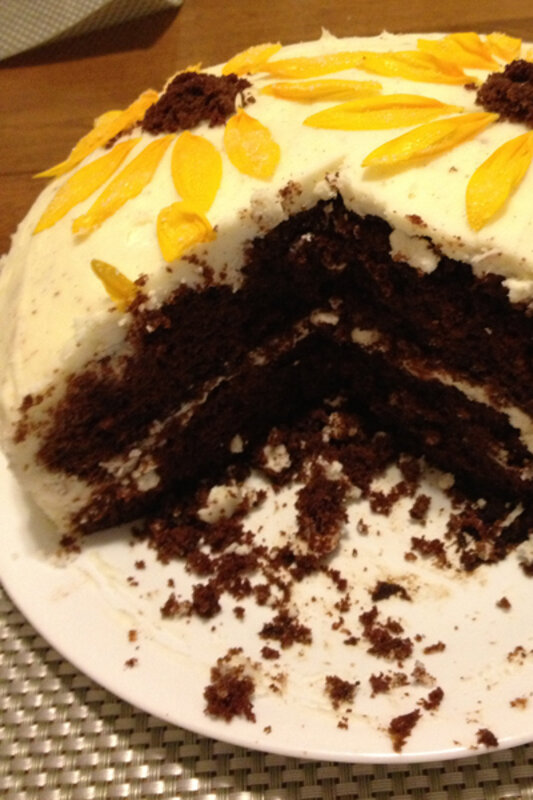 The next morning a moment of inspiration struck and I decided to use the leftover cake crumbs as the center of my "sunflowers" in the decorating process. Sunflower petals are 100 percent edible, and with a quick egg white wash and a sprinkle of sugar they were ready to go. While not quite as professional-looking as the decorated cake I made last year, I thought my sunflower topped-cake came out pretty darn cute (never mind that beneath all the frosting the cake was in about 20 pieces).
