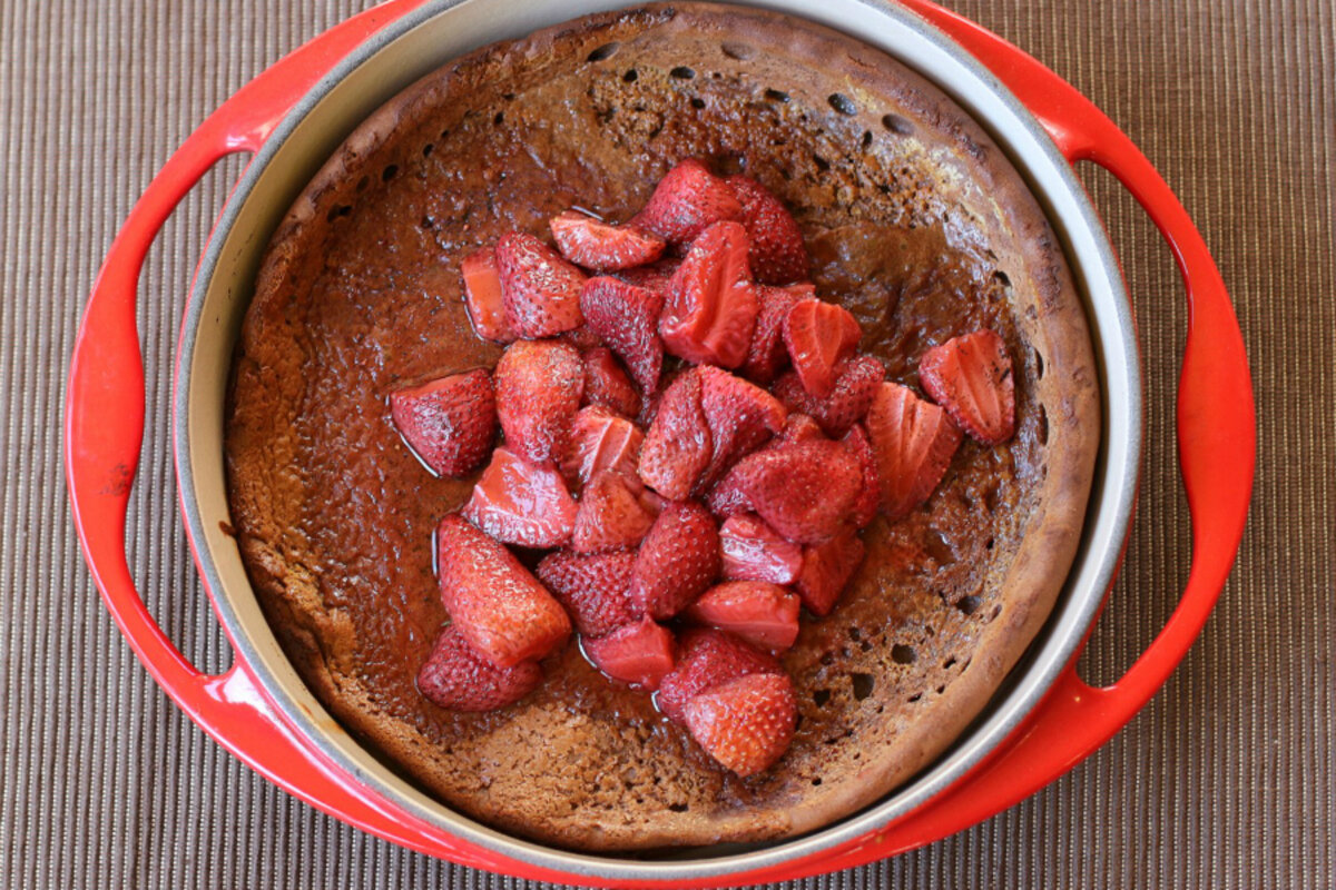 3. Spoon the strawberries over the Dutch baby immediately and serve.