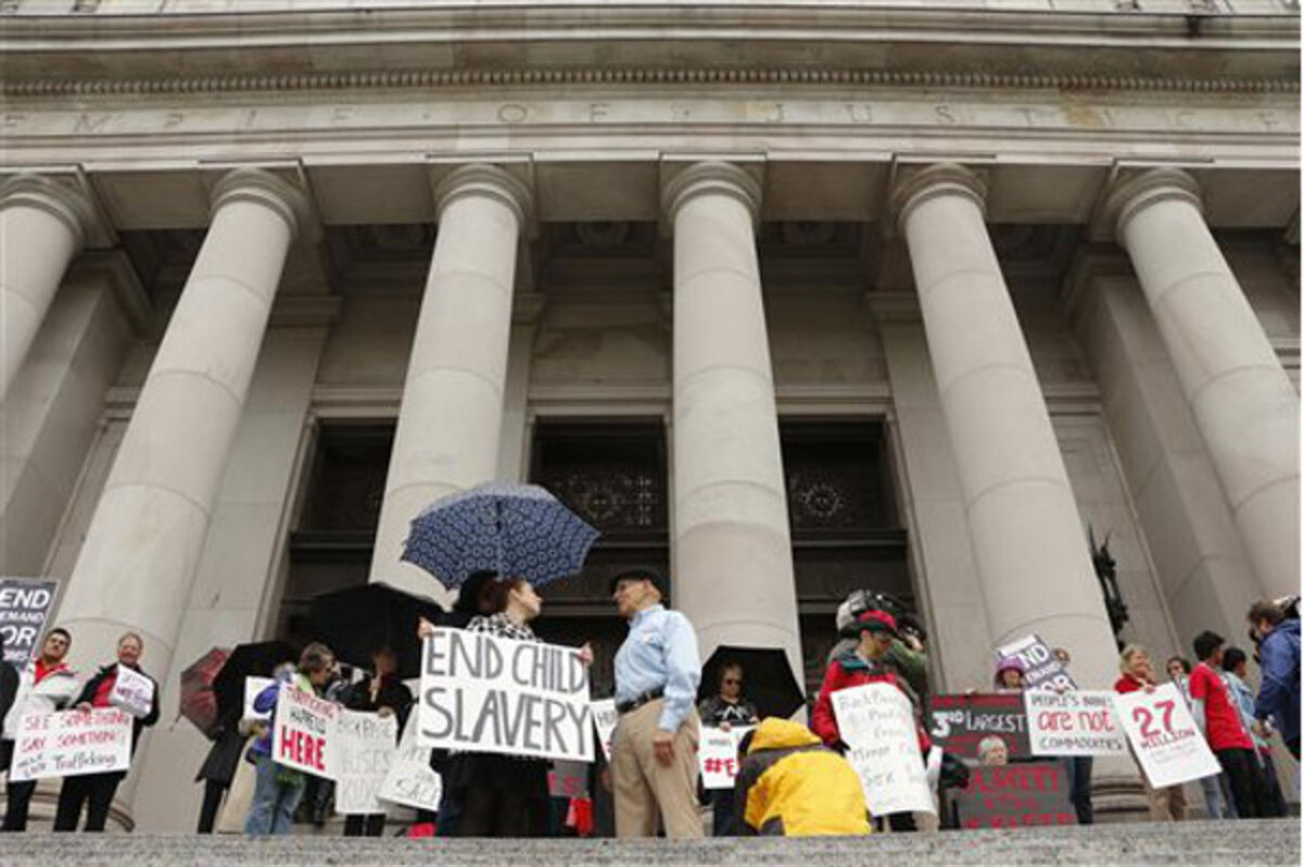 Before the hearing several dozen people stood in the rain on the court steps with signs that read: "People's bodies are not commodities," ''End Child Slavery" and "Stop Buying Our Girls."