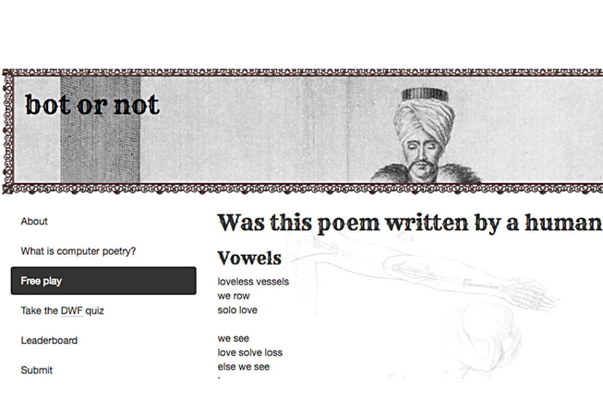 Indeed, more people thought this poem "Vowels" by Canadian poet聽海角大神 B枚k on the Bot or Not website was written by a computer than a human.