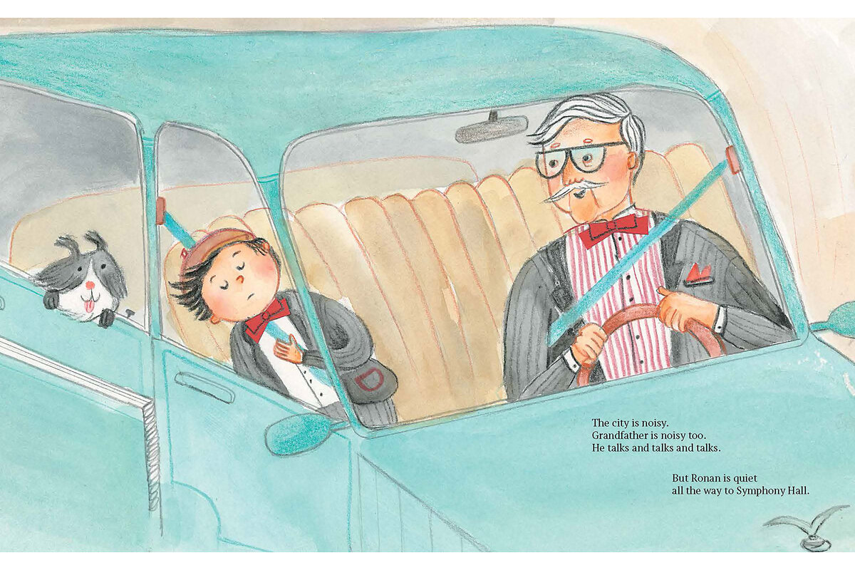 The book鈥檚 author worked closely with Ronan鈥檚 family, and wisely keeps the story simple, which allows Kheiriyeh鈥檚 drawings to shine. Composed mostly in shades of gray and turquoise with pops of poppy red, her illustrations offer a nostalgic nod to a Boston past: Grandfather sports a dapper tux with tails and drives a classic car; Ronan wears suspenders, a beret, and a bow tie.