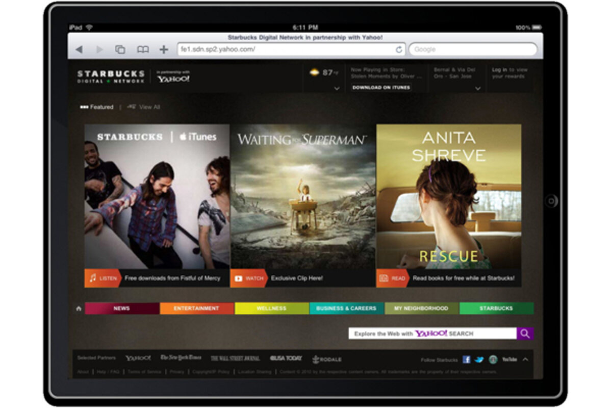 Starbucks began offering free wireless Internet in its stores in July. As of today, when customers take advantage of Stabucks' Internet access, the first thing they see will be a welcome page inviting them to read books (or pieces thereof), watch movies, and enjoy access to some paid sites like The Wall Street Journal. Additional partners include The New York Times, USA Today, Apple's iTunes, local news provider Patch, and Zagat.