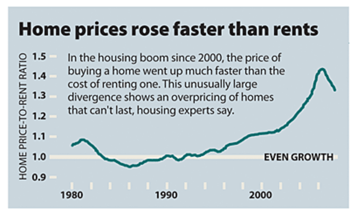 After two decades when home prices and rents changed at fairly similar paces, soaring home prices since 2000 have pushed the price-to-rent ratio about 33 percent above its long-run average, according to research by Merrill Lynch in New York.