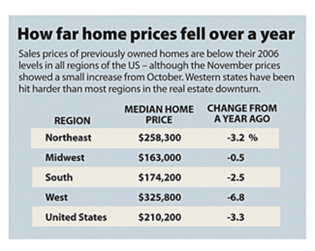 America's median home price is now $210,200, down 3.3 percent from a year ago but 7.6 percent above its 2004 level.