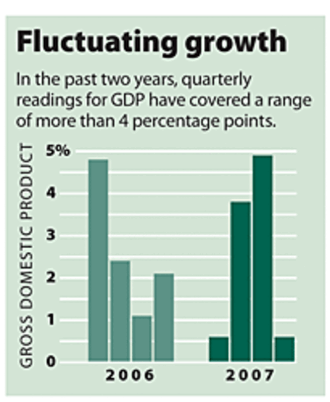 A measure of how close the economy is to dropping into negative territory came on Wednesday, when the Commerce Department, in a preliminary estimate, said the gross domestic product rose by a 0.6 percent rate in the last quarter of 2007. This was the lowest rate of growth since the first quarter of last year. In the ensuing year, the banking system wrote off billions of dollars in bad debt, housing prices fell by more than 7 percent, and consumers became more cautious, especially as energy prices soared. For 2007 overall, the Commerce Department estimated that GDP rose 2.2 percent.