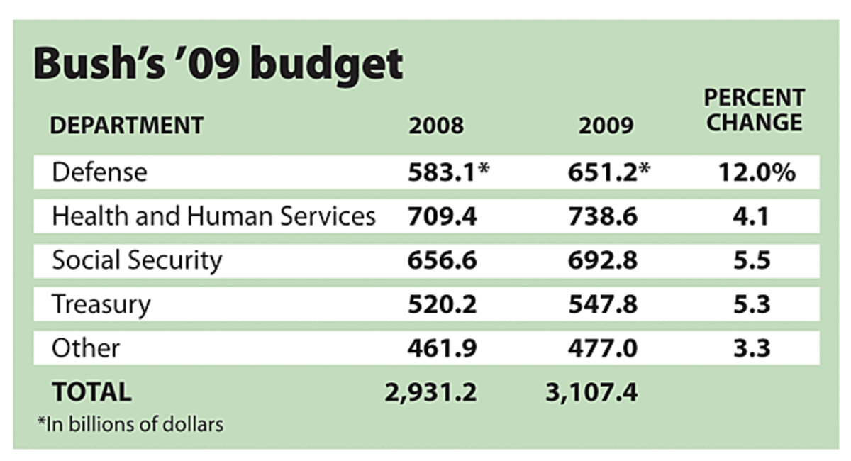 The president's 2009 budget, released Monday, calls for $3.1 trillion in federal spending. That marks the first time a proposed budget has broken the $3 trillion mark. By way of contrast, Bush's first budget, way back in 2001, called for less than $2 trillion in outlays.