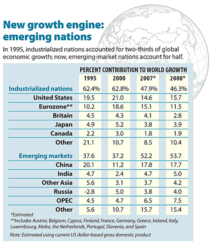 And if the emerging markets do keep growing during a developed-world slump, economists note, they could at least cushion the blow for others. They will continue to import the industrial machinery that US and other advanced nations make and will still have an appetite for raw materials such as oil and minerals from the Middle East, Africa, and Latin America.