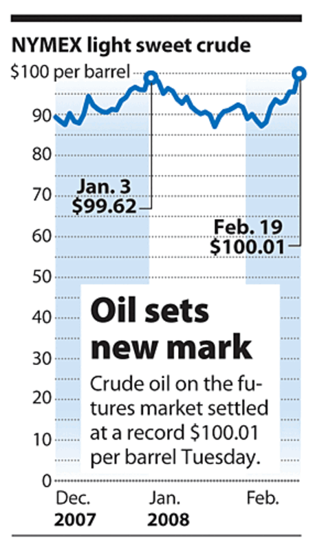 On Tuesday, the price of oil hit a record $100.01 a barrel, up some $14 in eight trading days. It's the second time since late December that the price has hovered at the $100-a-barrel level.