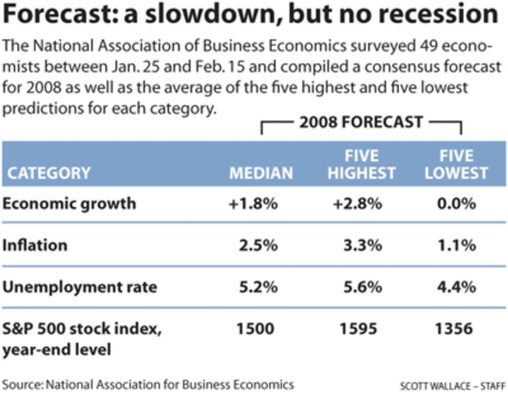 In a survey released this week, the consensus forecast among professional economists is for 1.8 percent growth in the US economy this year. Even the most pessimistic forecasters see a flat economy 鈥 with a period of recession but not an outright contraction for the whole calendar year.