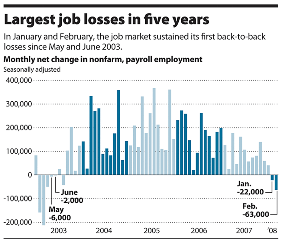 Last month, layoffs spread beyond the housing sector and financial institutions. The durable-goods business lost 40,000 jobs. In the auto industry, 12,900 jobs disappeared. In the past year, employment in that industry shrank by some 75,500 jobs.