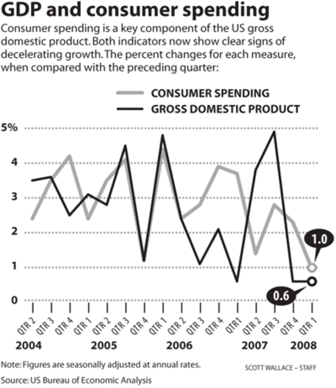 Some analysts say that Wednesday's preliminary tally of first-quarter economic activity was weaker than the overall GDP number suggests. Consumer spending rose, but at a tepid 1 percent pace, and spending on durable goods fell at a 6 percent annual rate, notes Michael Darda, chief economist at MKM Partners in Greenwich, Conn. He says the economy may enter a recession, based on payroll and income data, even if it does not see two quarters of negative growth.