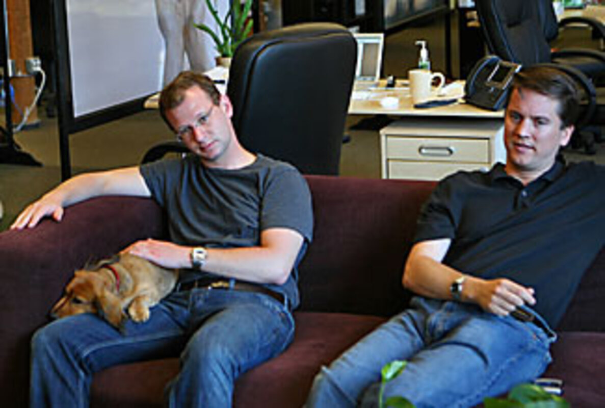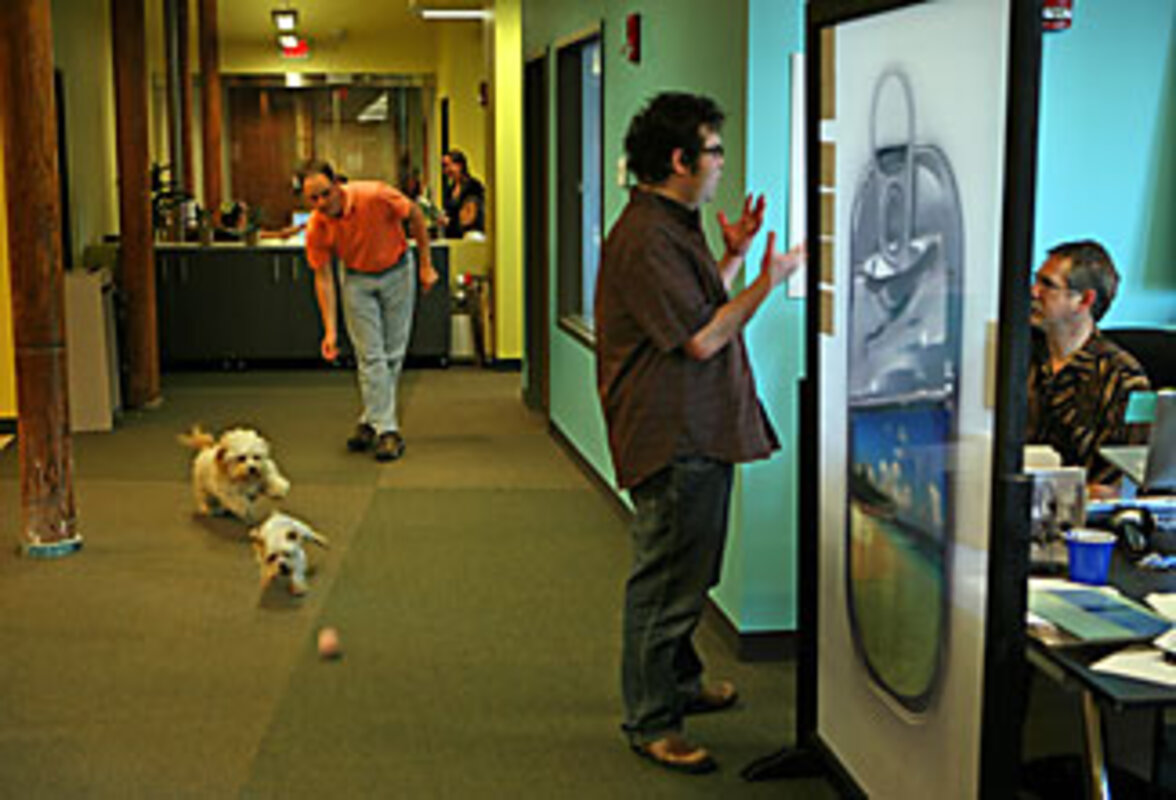 At Sermo, a Web company whose offices resemble a Romper Room for adults 鈥 complete with beanbags and arcade machines 鈥 finding the CEO is easy. Just look for his dogs. This particular afternoon, Daniel Palestrant's two dachshunds act like draft stoppers outside their master's conference-room door. Mr. Palestrant is something of a Pied Piper for dogs and instituted the office's pet-friendly policy. As such, he loves to see employees playing with Lily, a Yorkshire terrier that treats a pink tennis ball like a homing beacon, or stroking Maddie, a woolly bichon fris茅.