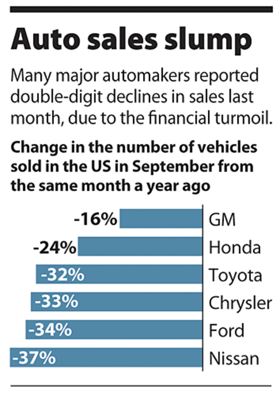 The crunch is particularly difficult, he says, for independent auto dealers and used-car dealers. In September alone, he says, nearly 1,000 independents or used-car dealers closed their doors in the US. "They can't get their customers an auto loan," he says.