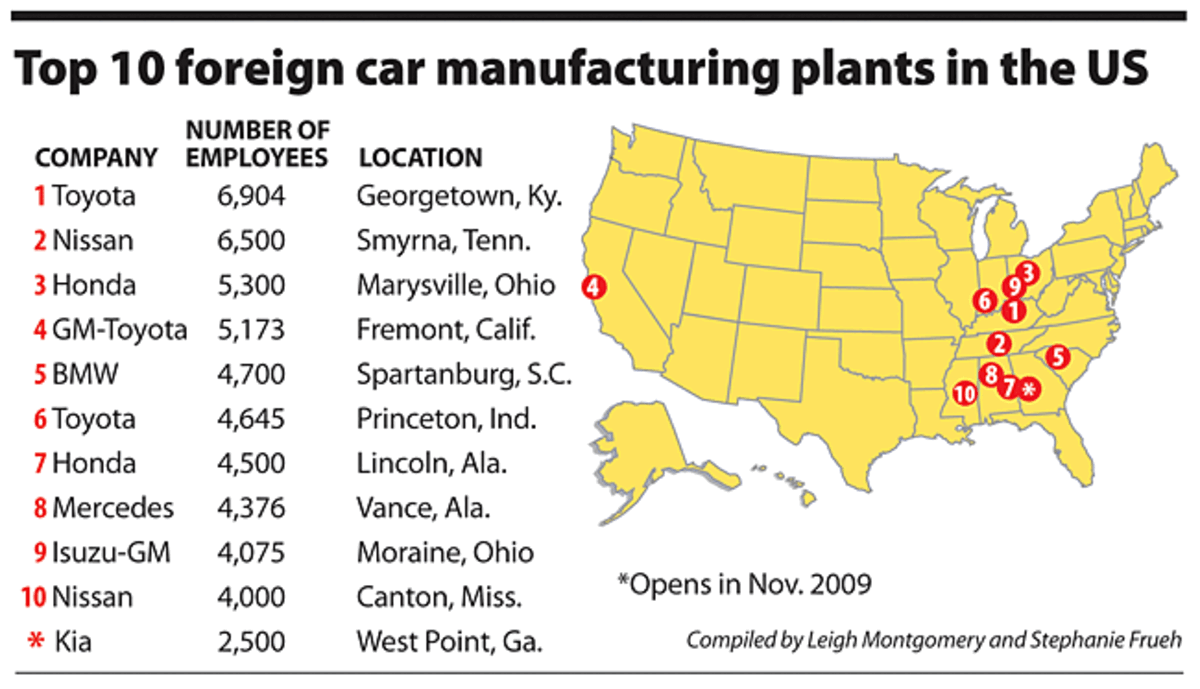 Around the South and especially here on Interstate 85 鈥 nicknamed the "autobahn" for the prevalence of foreign-owned car plants along its stretch 鈥 the manufacture of foreign vehicles has jumped 450 percent since 1986. While the Big Three have shed more than 600,000 jobs since 1980, foreign automakers have created about 35,000 jobs in the same period.