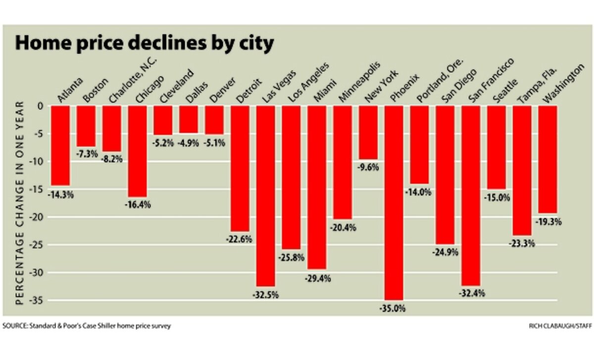 According to numbers released Thursday, a 20-city average of home prices fell 2.8 percent in January, faster than the 2.6 percent drop recorded in December. Overall, the 20-city Case-Shiller index reported by Standard & Poor鈥檚 has fallen 19 percent in the past year and nearly 29 percent from its peak in 2006.