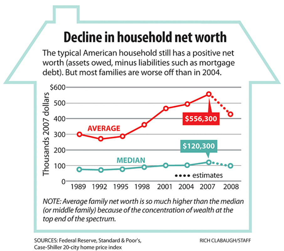 The typical family still has a positive net worth, with assets (financial plus home equity) larger than liabilities (such as mortgage and credit-card debts). But millions of households, including those that took loans to buy a home or withdrew home equity in recent years, have a negative net worth. Personal bankruptcy filings rose above 1 million in the past year, double the rate in 2006.