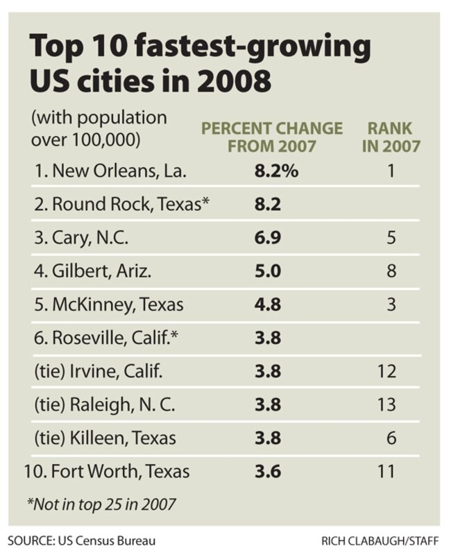 But New Orleans topped the list in percentage terms, reflecting continued rebuilding after hurricane Katrina. Texas hosts four of the top 10 cities, including Round Rock 鈥 which was No. 2 鈥 Killeen (9), Fort Worth (10), and McKinney (5).