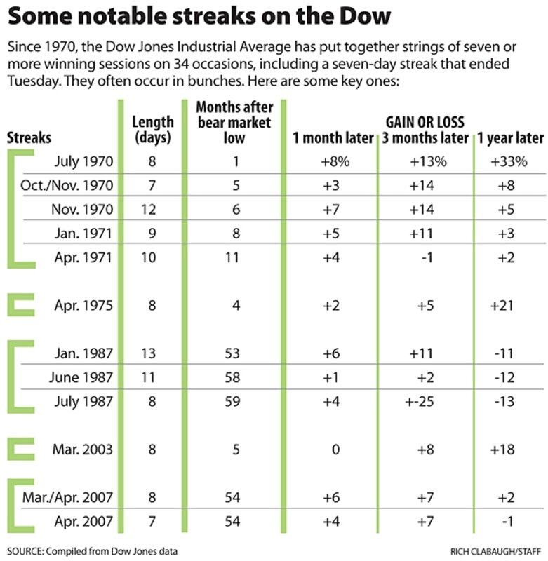 From July 13 through Tuesday, the Dow Jones Industrial Average rose every day for an overall gain of nearly 10 percent. (The Nasdaq is still on the upswing, rising 11 days in a row through Wednesday.) Since 1970, the Dow has only had 33 streaks of seven or more up days 鈥 34 if you count the one that ended Tuesday. So what can the streak tell us about the future, if anything?