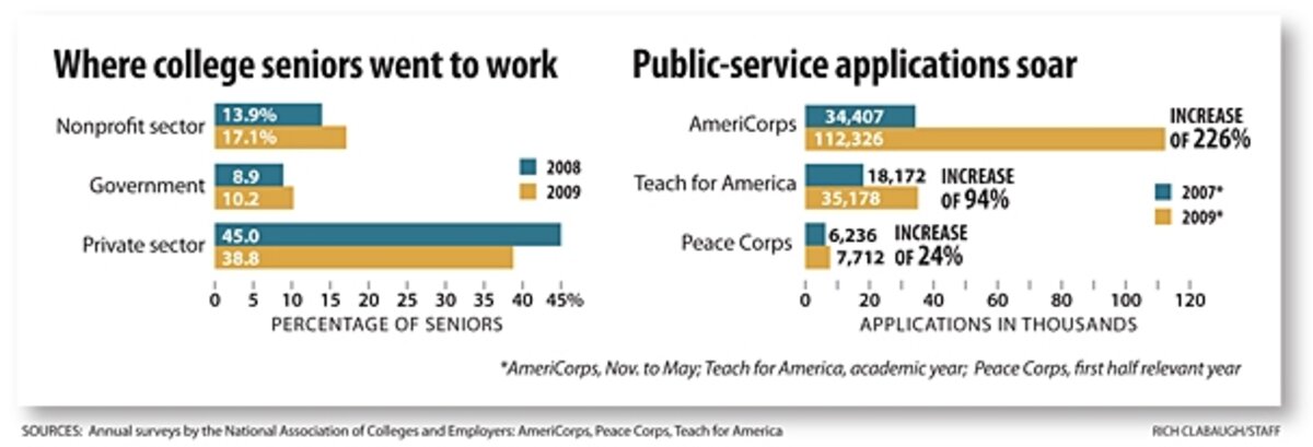 Gubbala is joining tens of thousands of recent graduates opting to work in public service, part of a generational shift similar to the one seen after President Kennedy called for service and began the Peace Corps in 1961. The Peace Corps, which funnels nearly 8,000 Americans a year to underdeveloped countries for two-year volunteer stints, has seen a 24 percent surge in applications in the first half of 2009 compared with the same period two years ago. Its stateside corollary AmeriCorps and Teach for America, which places college graduates in K-12 teaching positions across the country, have seen even bigger increases. (See chart.)