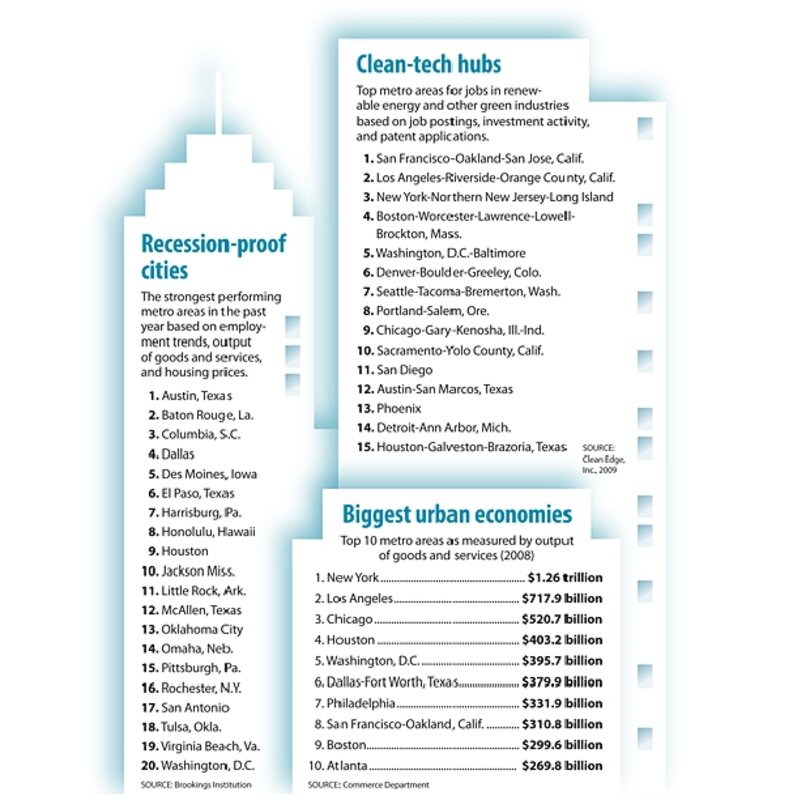 Any list is a bit arbitrary. But below are some cities that at least show the forces remaking urban America, hastened by the rasp of recession. 鈥淭he collapse two years ago was so dramatic, so unexpected,鈥 says Barry Mason, dean of the business school at the University of Alabama. 鈥淏ut out of crisis comes opportunity.鈥