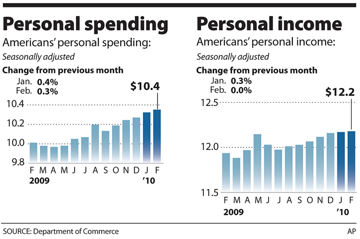 "Overall, real consumer spending is on track to rise just above 3 percent [annualized] in the first quarter, which would be the strongest increase in three years and much better than the fourth quarter's 1.6 percent," economist Nigel Gault of IHS Global Insight says in a written analysis of the numbers. Spending "is being helped by a stabilizing labor market and, temporarily, by around $20 billion in refundable 'Making Work Pay' tax credits being paid out as workers file their 2009 tax returns."