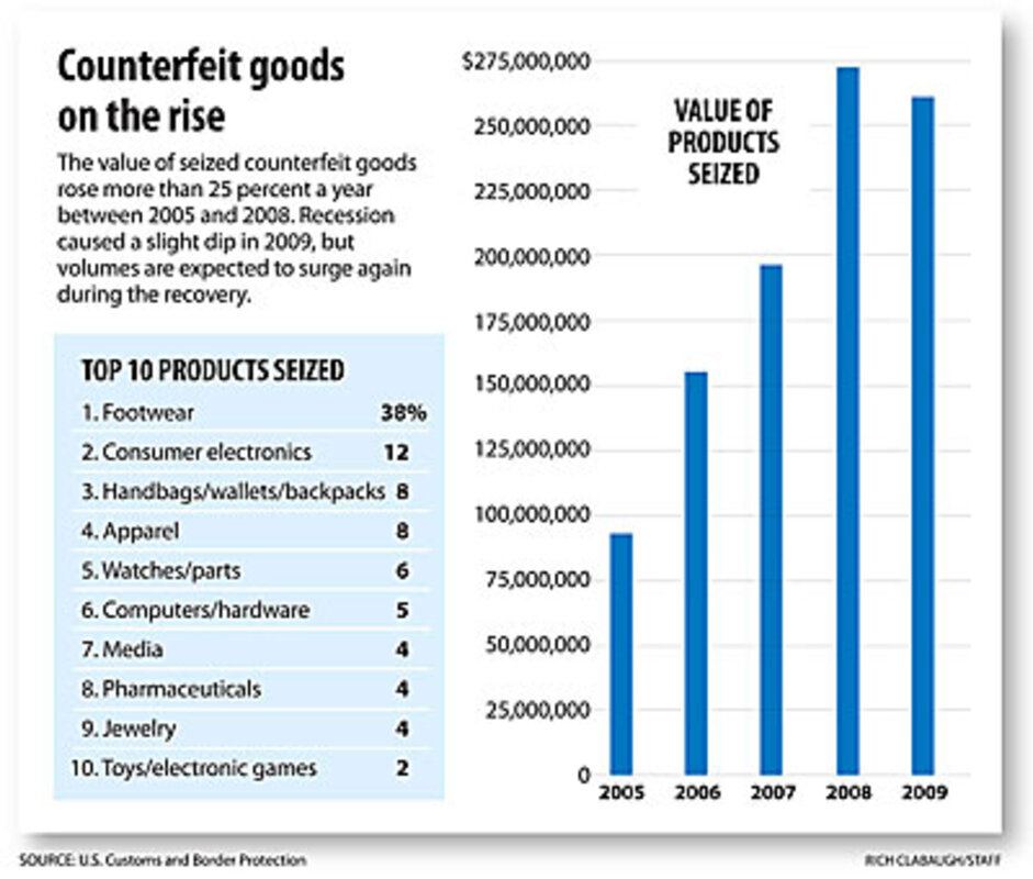 Counterfeiting goods is one of the fastest growing crimes in the US. The total value of IPR seizures rose more than 25 percent a year between 2005 and 2008, according to US Customs and Border Protection. Last year, because of the recession, IPR seizures and the value of the seizures dropped slightly: 1 percent and 4 percent, respectively. Still, there were 14,841 IPR seizures in 2009 with a domestic value of $260.7 million. And in the context of an overall 25 percent drop in US imports, "really, we equate that [slight dip] to an increase," Mr. Halverson says.