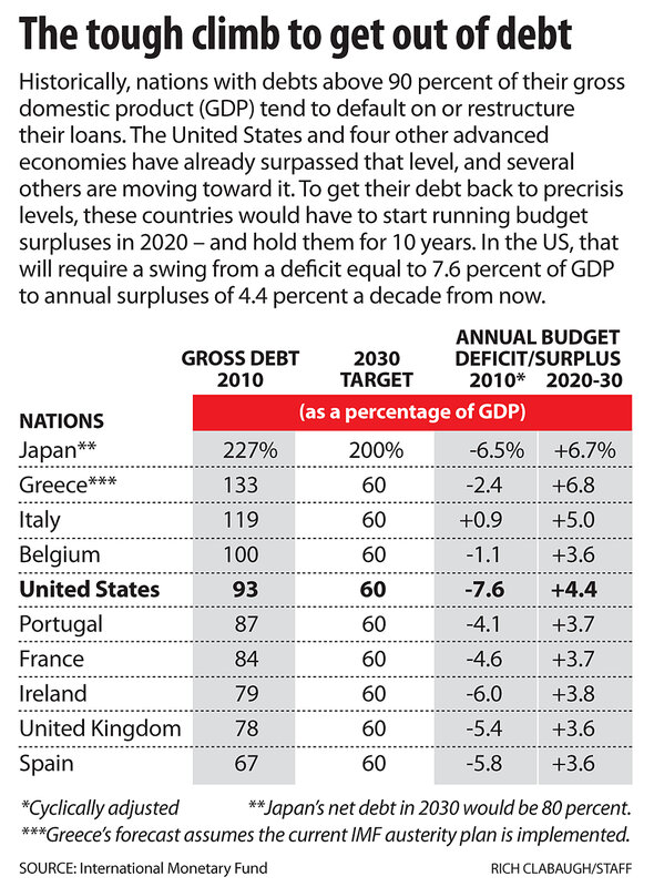 Even then, it is difficult to envision a way to get back to a precrisis debt-to-GDP ratio of 60 percent. The International Monetary Fund (IMF) calculates that the US government will have to swing from a (cyclically adjusted) deficit of 7.6 percent this year to a 4.4 budget surplus in 2020. Then, those budget surpluses would have to last another decade. That's a huge swing of 12 percentage points in the budget, which represents hundreds of billions of dollars. It's a bigger turnaround than even Greece still has to make beyond its current austerity plan (see chart at right).