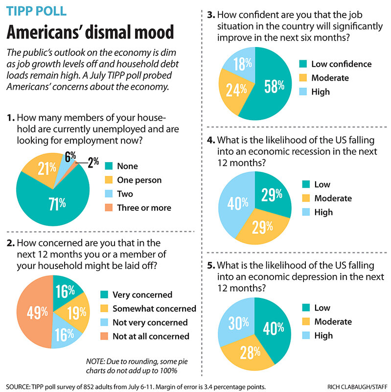 Overall, Americans are still gloomy on the economy, according to a new TIPP poll of American adults. An index that measures economic mood fell in July for the second straight month and has been in pessimistic territory (below the 50 mark) for the year. Its July reading of 44.7 is well above its 2008 low of 37, but the index is at a new low since February 2009.