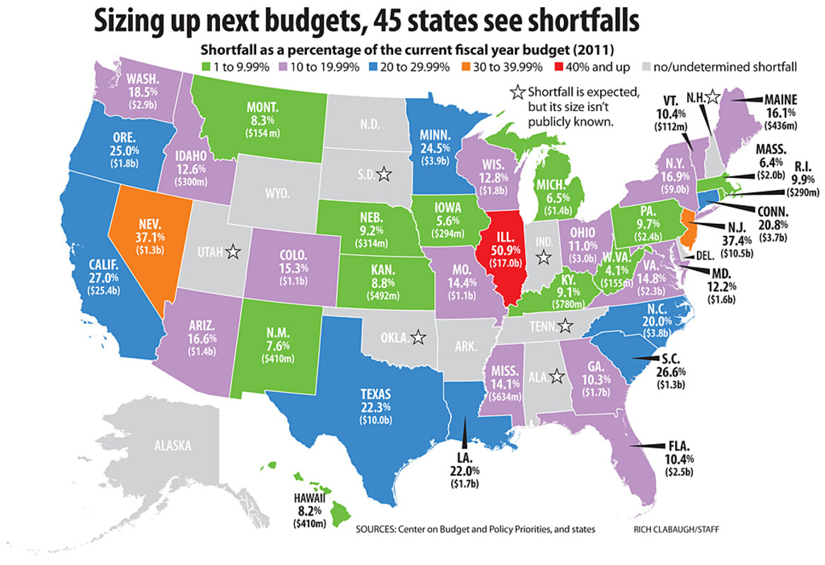 Forty-five states are expected to need to cut their next budgets, some a little and some drastically. Many states have difficult but manageable shortfalls, but 10 face budget gaps of 20 percent or more over this fiscal year's budget. Among them are some of the most populous states.