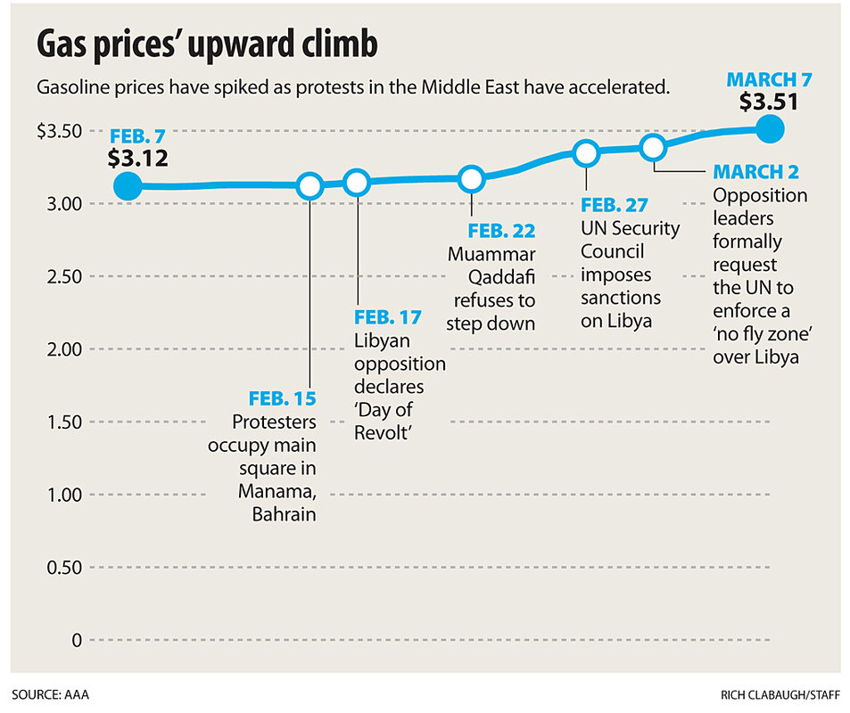 Gas prices soar past $3.50 per gallon: Are Middle Eastern uprisings to blame?