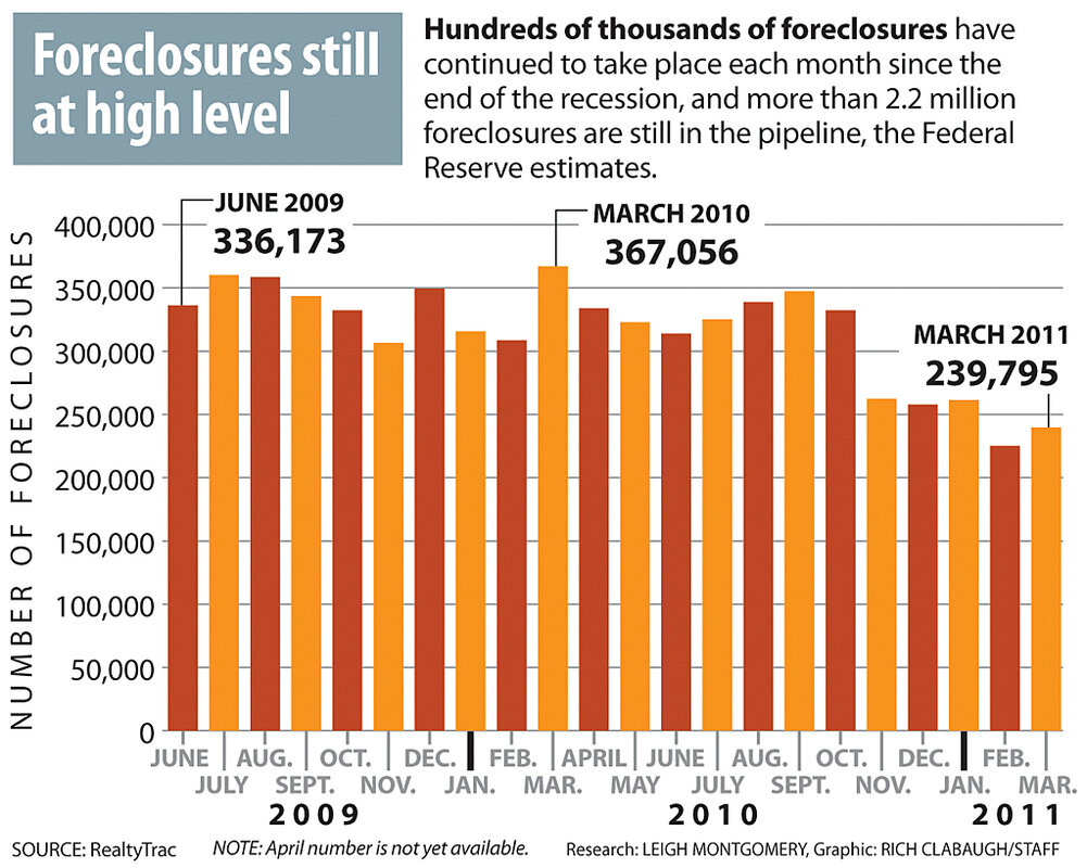 Mr. Newport expects home prices to fall another 5 percent this year. But if the labor market continues to gain ground, the number of foreclosures should drop. "Our projection is that things will begin to improve going forward, but at a slow pace," Newport says. "We won't be back to normal until 2014."