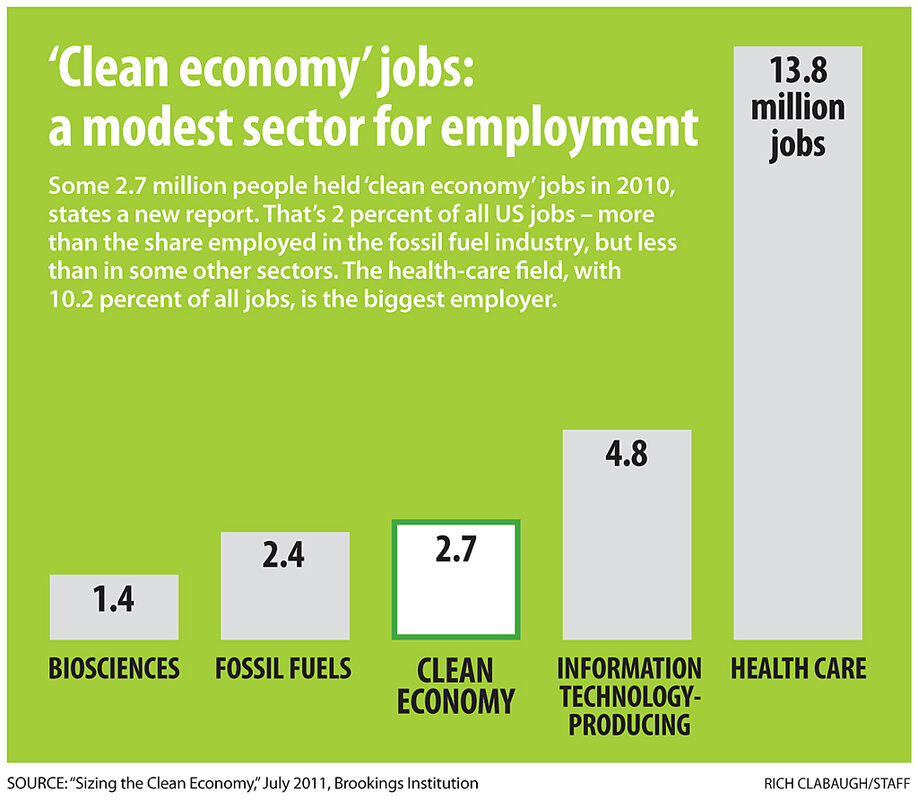 The clean-economy sector, for example, includes 2.7 million jobs. The oil and gas industry, by contrast, has 2.4 million jobs, and the biosciences industry has 1.4 million, the study notes. (A 2009 American Petroleum Institute study put the number of direct jobs in oil and gas at about 2.1 million.)