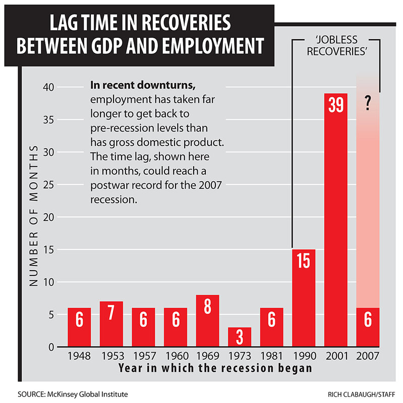 Certainly the current moment differs sharply from past recoveries from recession since World War II. It's different in its depth, with 6 percent of all US jobs disappearing. It's different in its duration, with the nation still nowhere near regaining those lost jobs two years later. (See chart, page 30.)