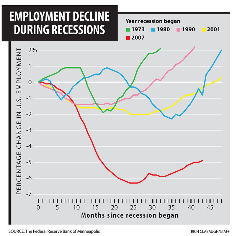 In recession periods in the mid-1970s and early '80s, employers didn't lay off as many workers as declining consumer demand suggested they could. In 2001 and 2008, by contrast, employers felt an imperative to keep their per-worker productivity from falling 鈥 and the result was deeper layoffs.