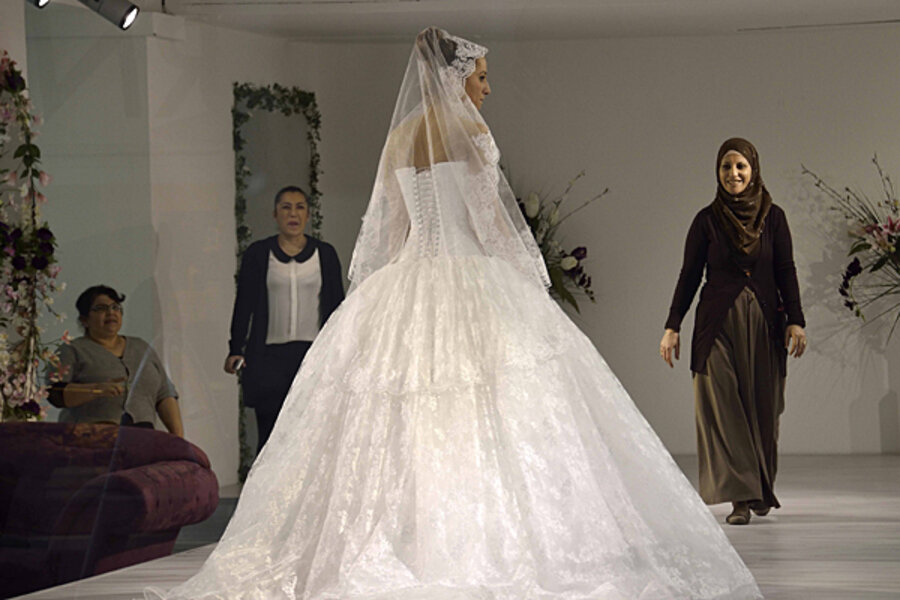 A Turkish woman wears a wedding dress in one of a dozen Turkish wedding stores in Duisburg-Marxloh, western Germany.