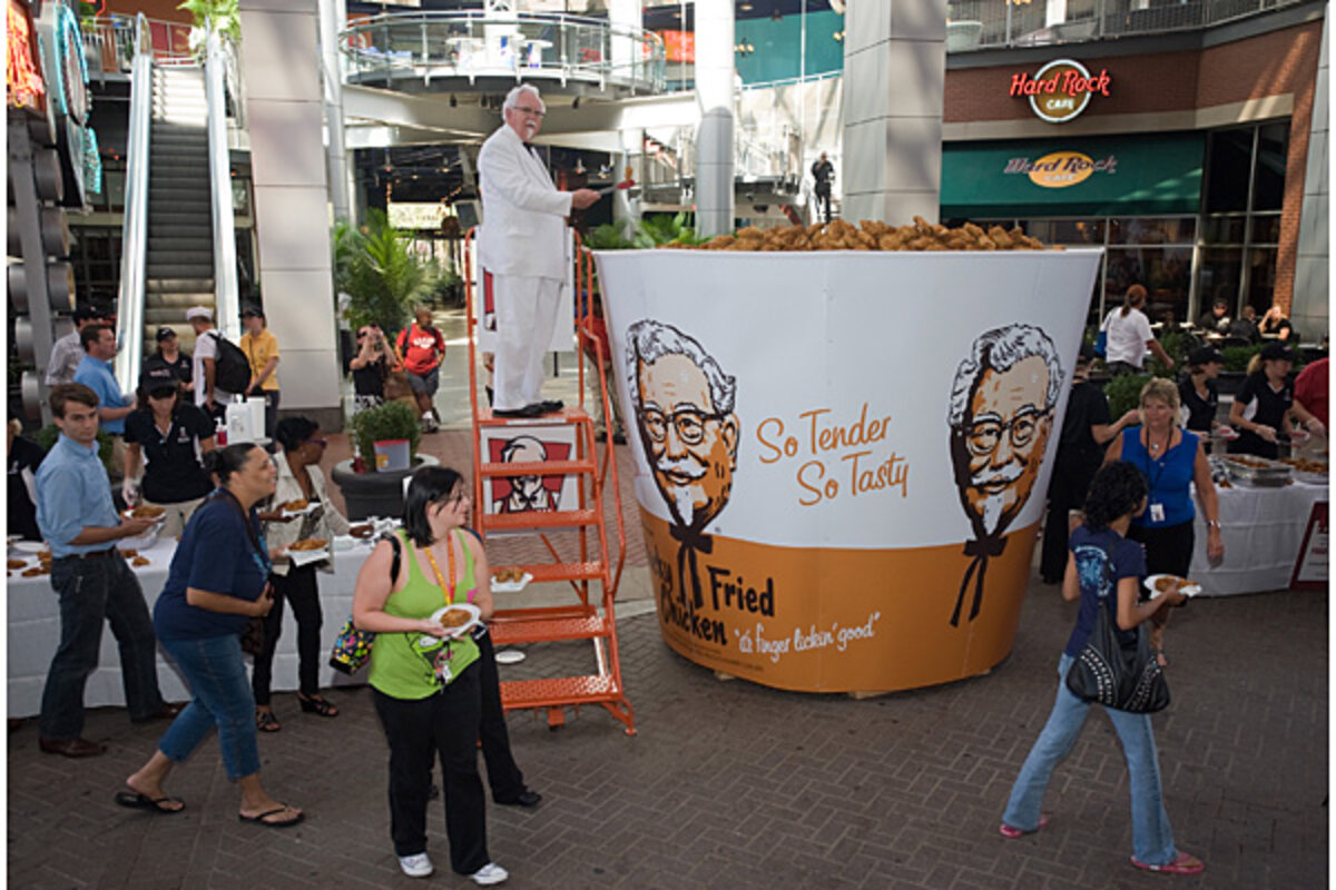 鈥淚 know what you鈥檙e thinking. The answer is no. There is no chicken in that 7-foot bucket,鈥 reporter Julie Meeks said in the TV piece.