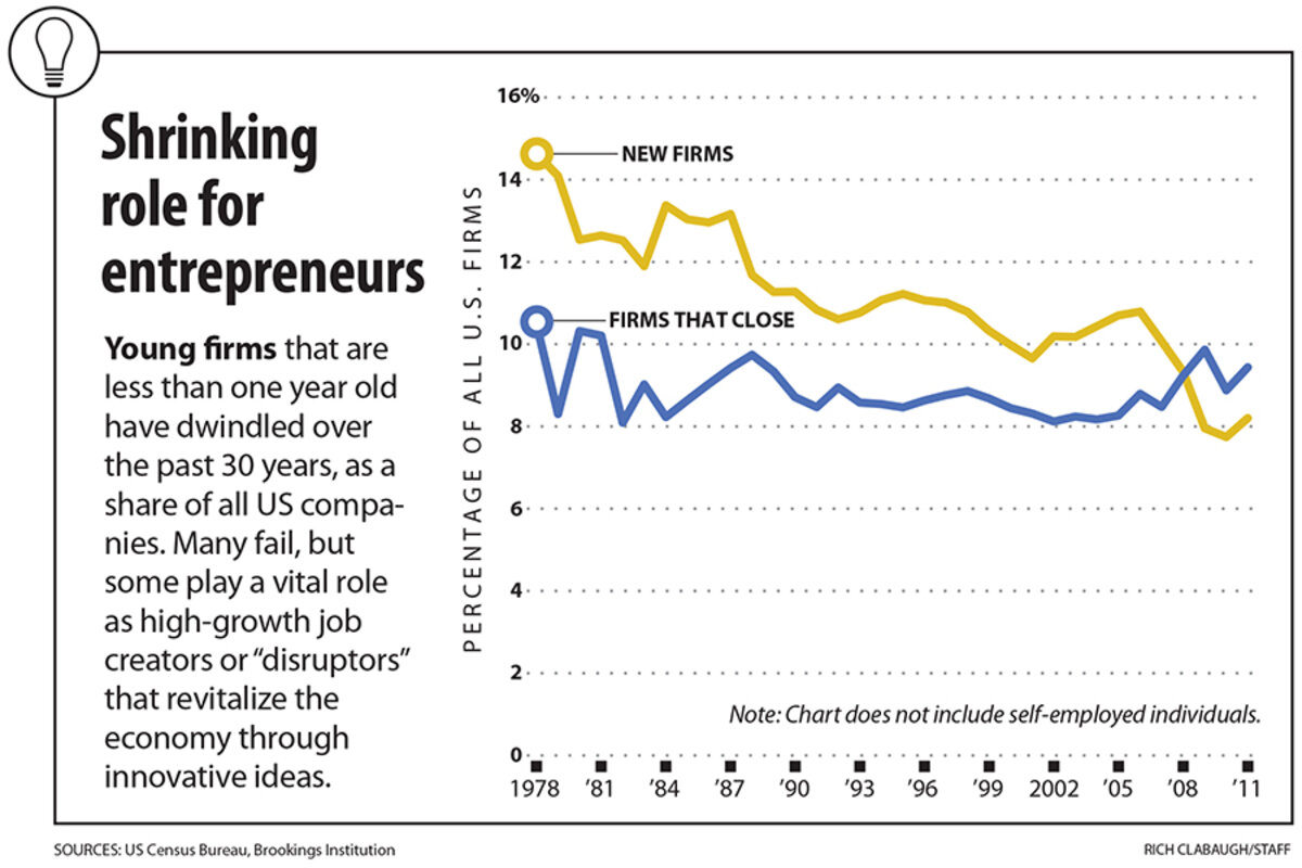 The pattern is clear in a new Brookings Institution report drawing on US Census data: Businesses less than a year old accounted for only about 8 percent of all US firms in 2011, down from nearly 15 percent in 1978.