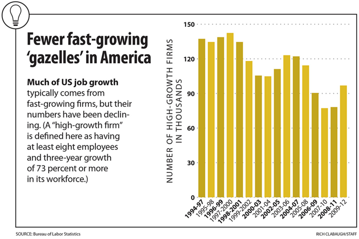 鈥he decline of young firms means a smaller pool of potential fast-growing companies 鈥 often called 鈥済azelles鈥 by economists. By one Labor Department definition, the US economy had only about 97,000 high-growth firms in the period from 2009 to 2012, down nearly 30 percent from the 1994-97 period.