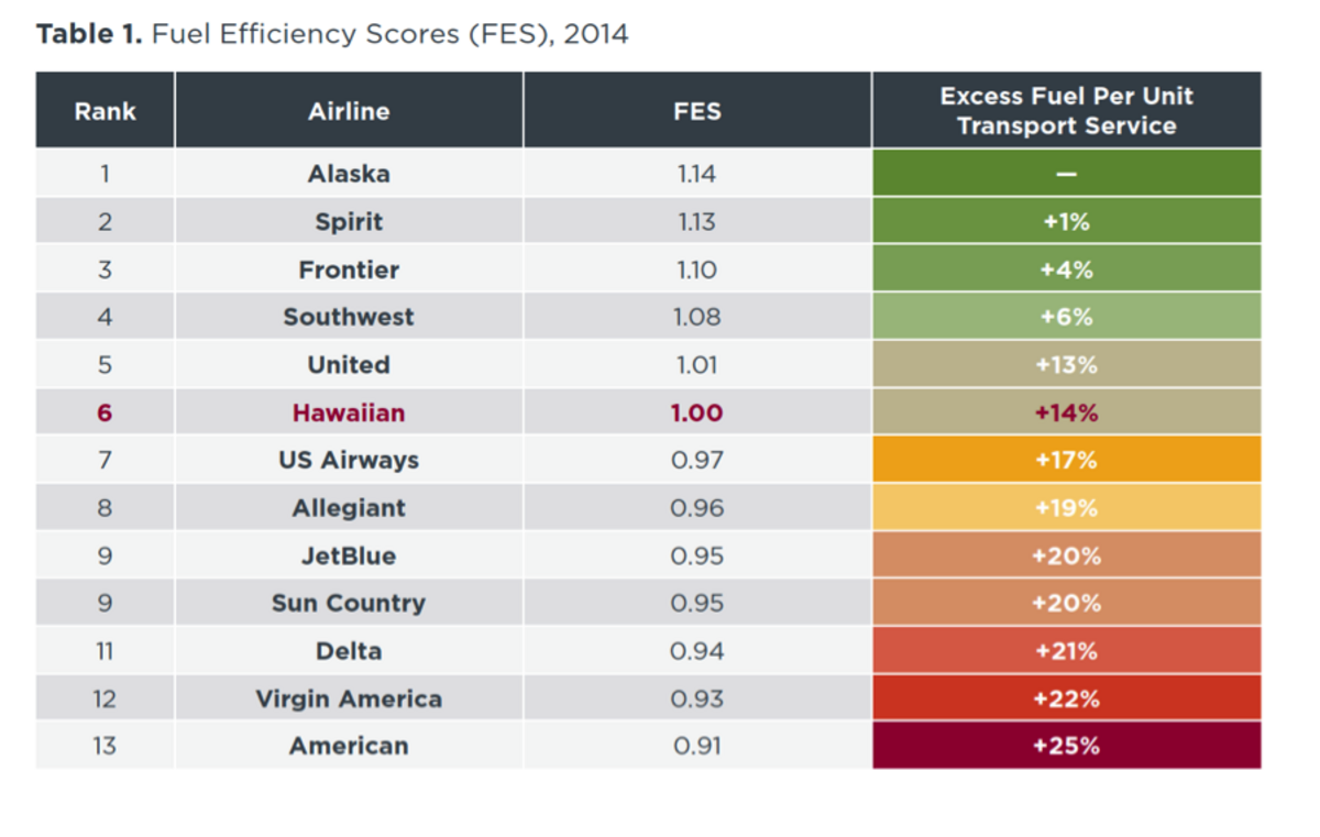 Biofuels are not the only way to improve airline efficiency, though, says Rutherford. Airlines can improve the efficiency of regular fuel by doing things like upgrading their fleets and using efficient flying routes. Based on those factors, the ICCT ranked United sixth-most efficient out of 13 American airlines in 2014, controlling for the number and length of flights each airline operates.
