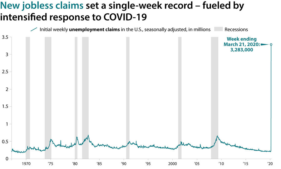 The latest evidence came Thursday, when the U.S. Labor Department reported that 3.3 million Americans filed initial jobless claims last week, a record in more than 50 years of data and more than four times the previous record.