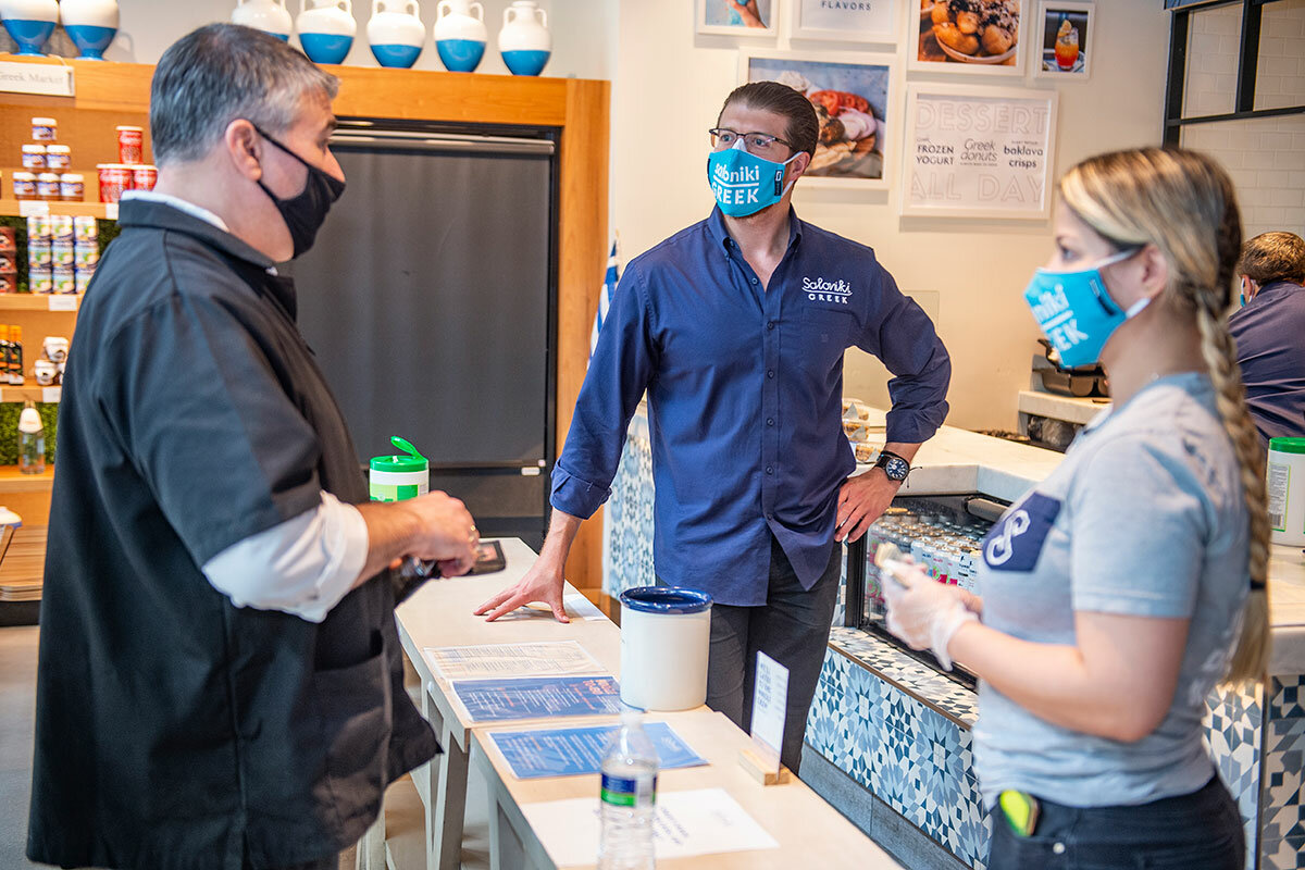 鈥淭he food鈥檚 good. It鈥檚 affordable,鈥 says Andrew Viglas, who cuts hair across the street, as he waits at the door to pick up a chicken souvlaki. Unlike the restaurant, his barbershop has been 鈥渟lammed鈥 since opening a few days before, but today is calmer, he says. Asked about dining out again at a restaurant, Mr. Viglas is wary. 鈥淚鈥檓 still a little nervous, but that鈥檚 today鈥檚 world.鈥