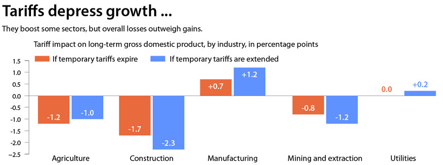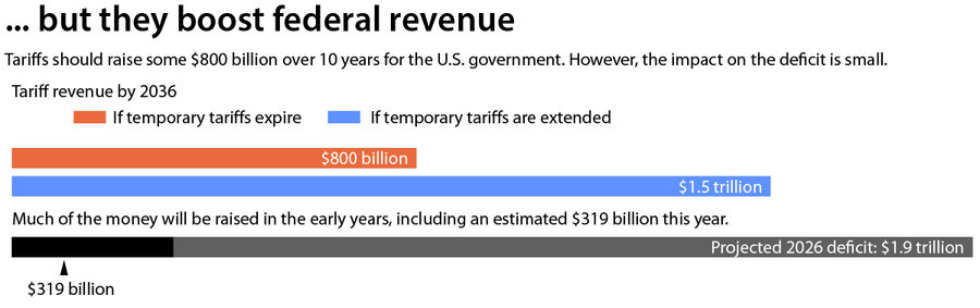 One bright spot is that tariffs are projected to funnel an extra $800 billion into government coffers in the next decade, even after accounting for a slight, tariff-driven slowdown. That will help trim budget deficits a little, although the administration may have to refund some of the money it collected from the tariffs now ruled illegal.