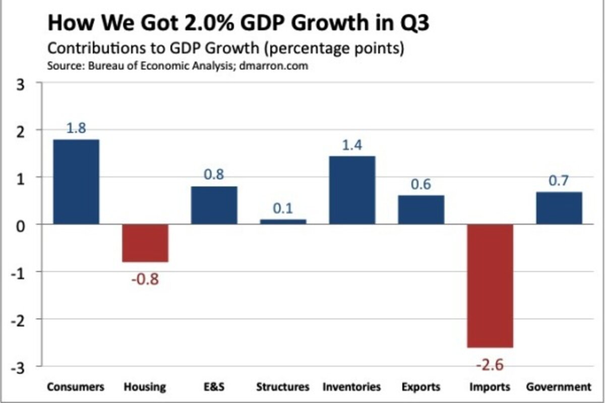The pessimistic take on inventories (see, for example, this ) is that the third quarter build up was unintentional, and thus is bearish for fourth quarter growth. The optimistic take, I suppose, is that maybe businesses see stronger demand ahead. But that feels rather, er, speculative.