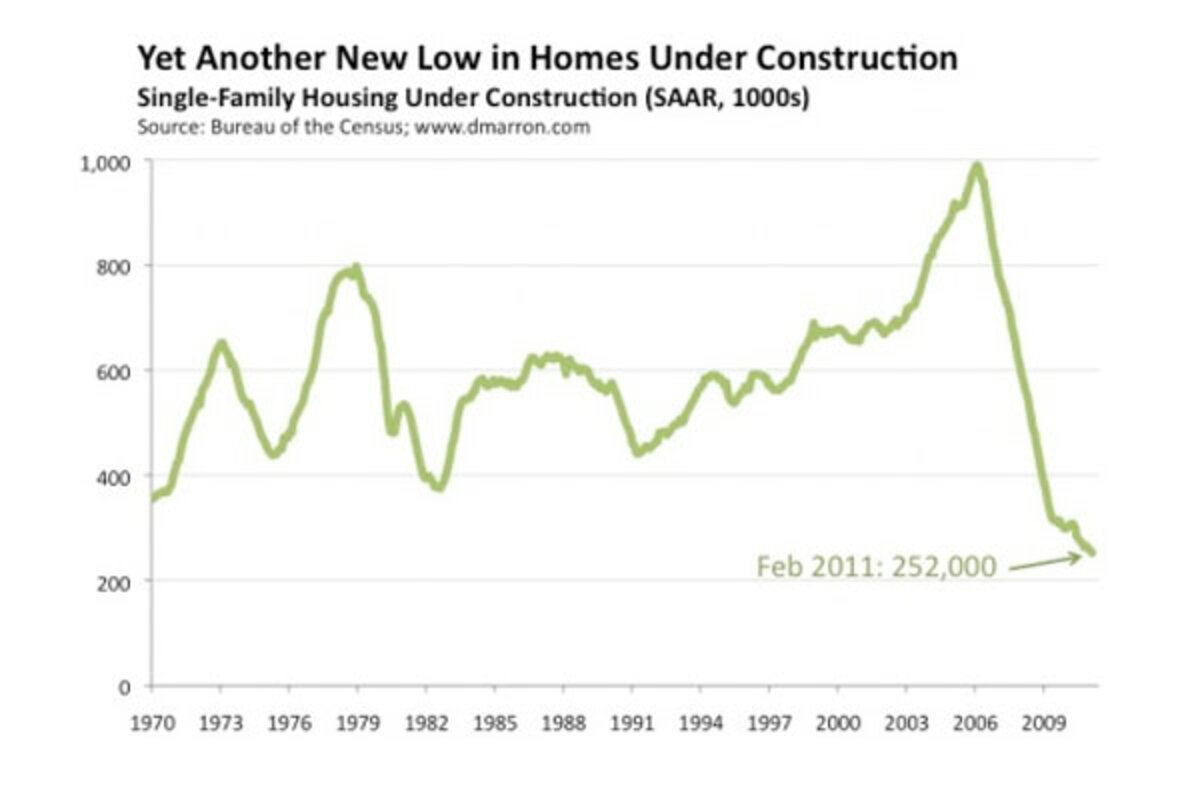 Ten years ago, America鈥檚 home builders were in the midst of constructing 672,000 single-family homes. Five years ago, they were building 990,000 homes. Last year, they were building 304,000. And now that figure is down to 252,000.