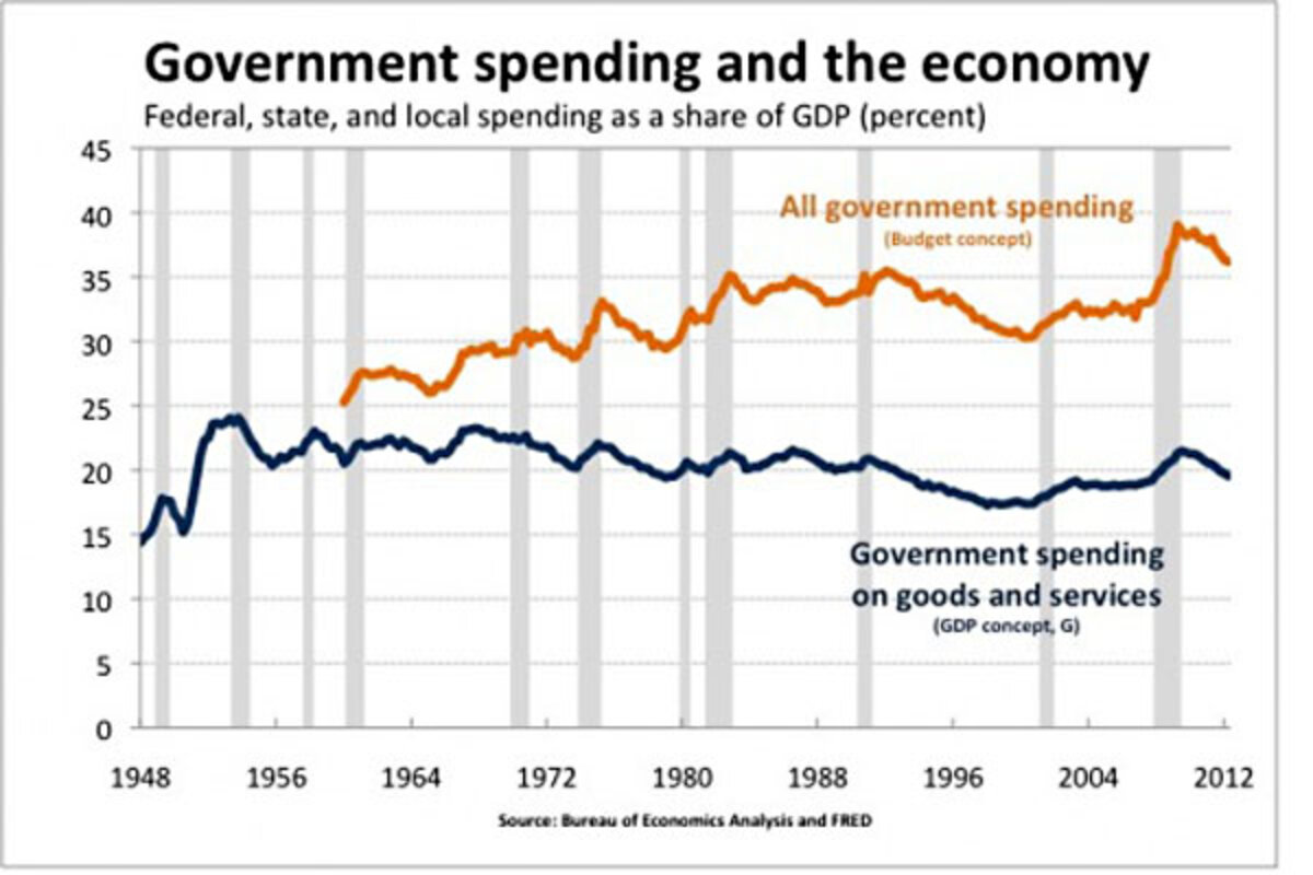 The blue line in the chart above shows how much federal, state, and local governments directly contribute to economic activity, measured as a share of overall gross domestic product (GDP). If you鈥檝e ever taken an intro economics class, you know that contribution as G, shorthand for government spending. G represents all the goods and services that governments provide, valued at the cost of producing them. G thus includes everything from buying aircraft carriers to paying teachers to housing our ambassador in Zambia.