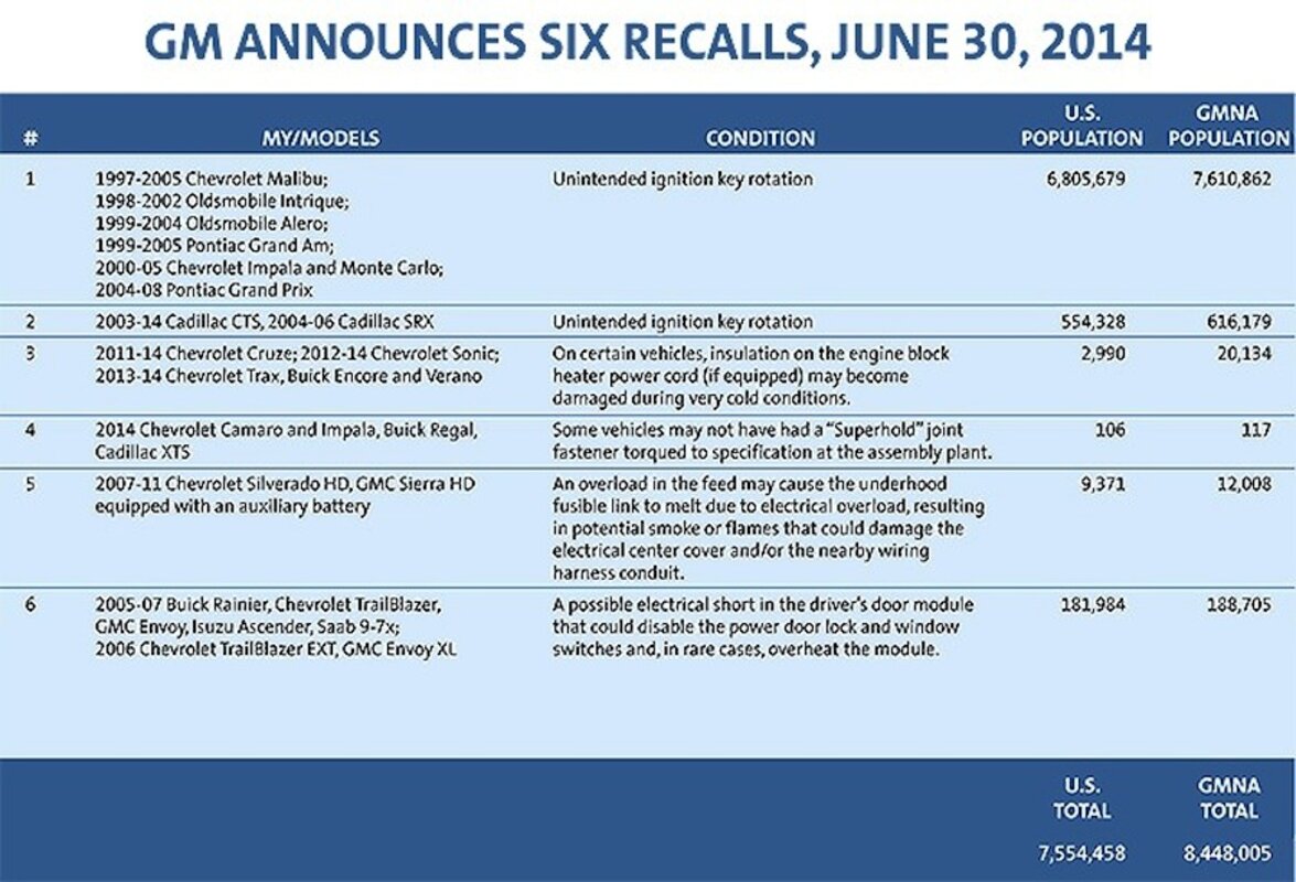 In early June, General Motors released a chart outlining all of the company recalls issued sine the beginning of 2014 鈥 at the time, 29 recalls had included 13.8 million vehicles in the US, for both the ignition switch problem and other issues. Since then, the company has made two more separate large-scale recall announcements: On June 17, GM recalled 3.4 million Buick, Cadillac, Chevrolet, and GMC vehicles for a wide range of defects, including ignition problems. Today鈥檚 announcement affected 7.6 million vehicles, though there may be some overlap with the previous announcements.
