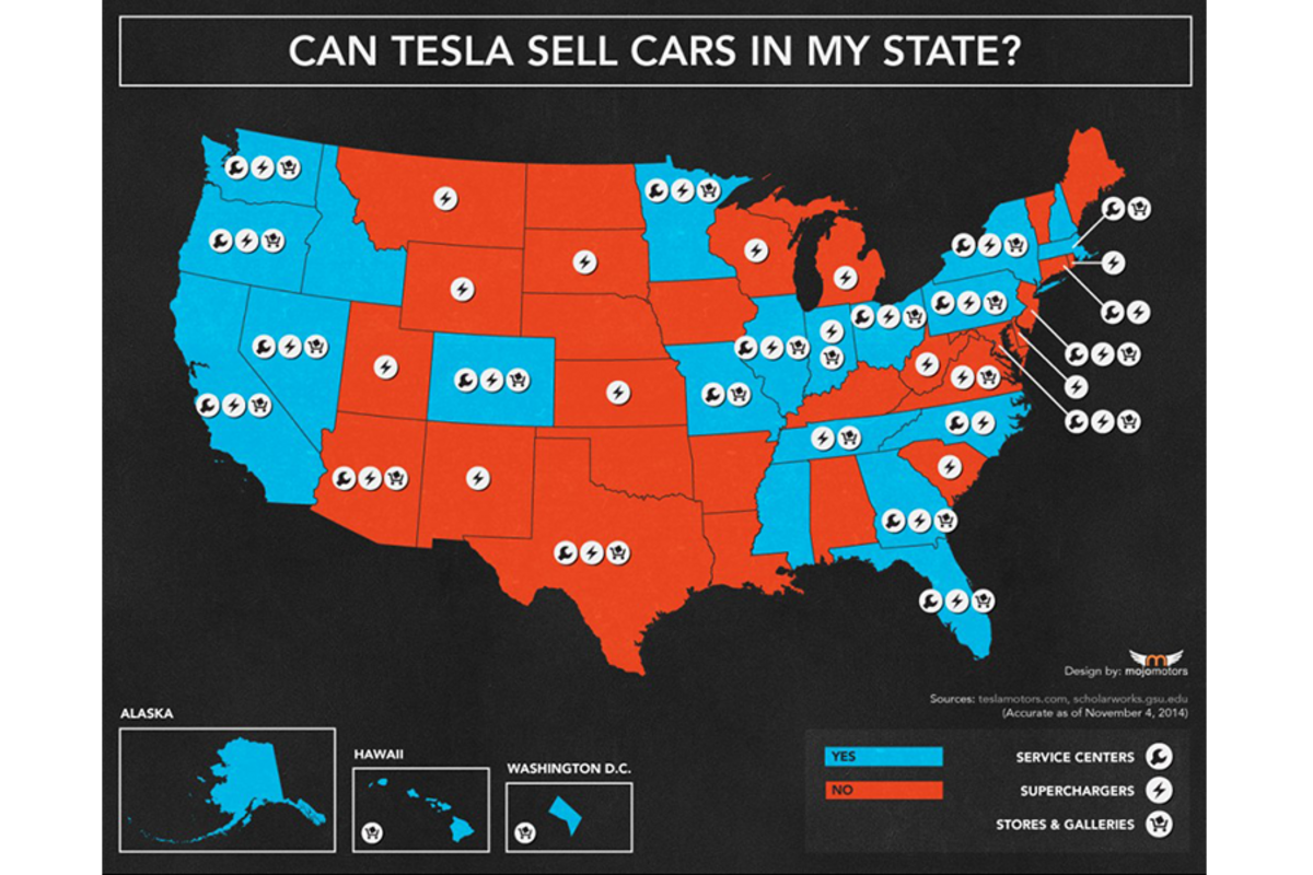 Indeed, a map of the states where it's legal for Tesla to sell聽聽directly correlates to some degree--but not perfectly--with a map of the blue states considered Democratic.