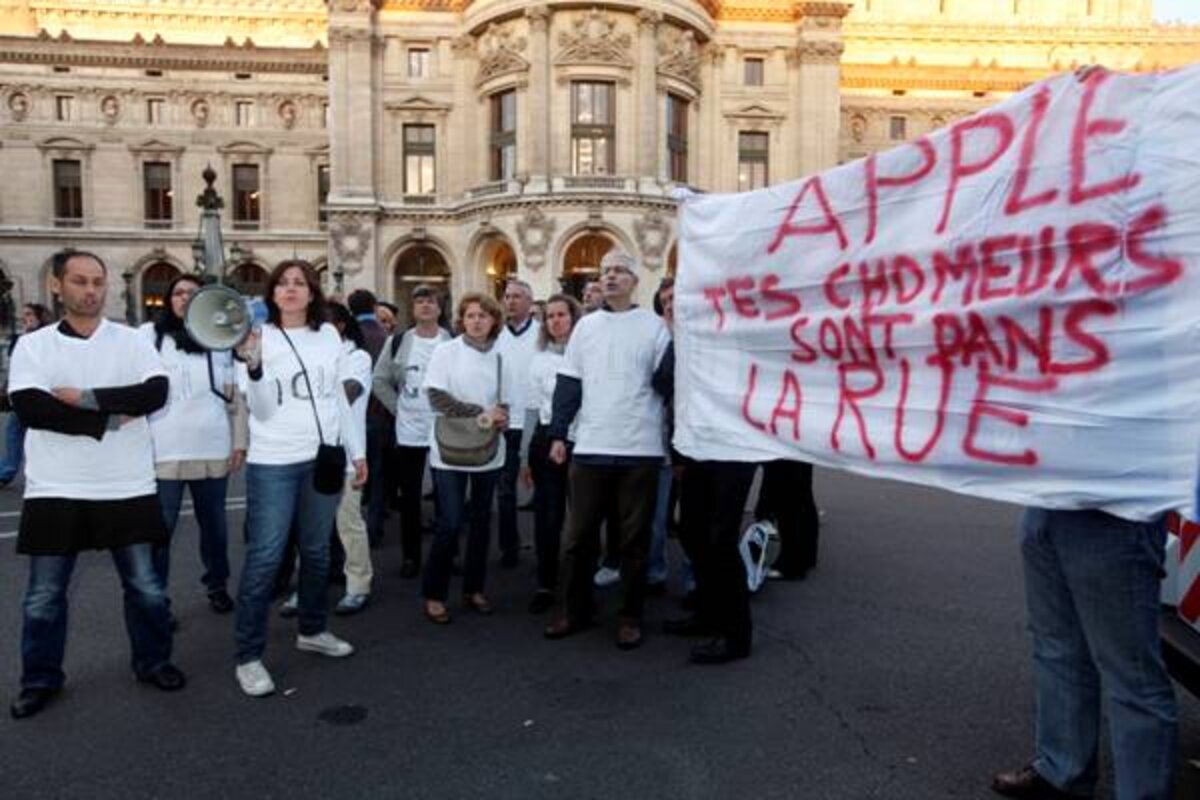 Gathering in front of the store, steps away from Paris' gilded opera house, protesters unfurled a white banner in front of the store's main entrance saying: "Apple, your jobless are in the street", but were kept at a distance by barricades and a handful of police.